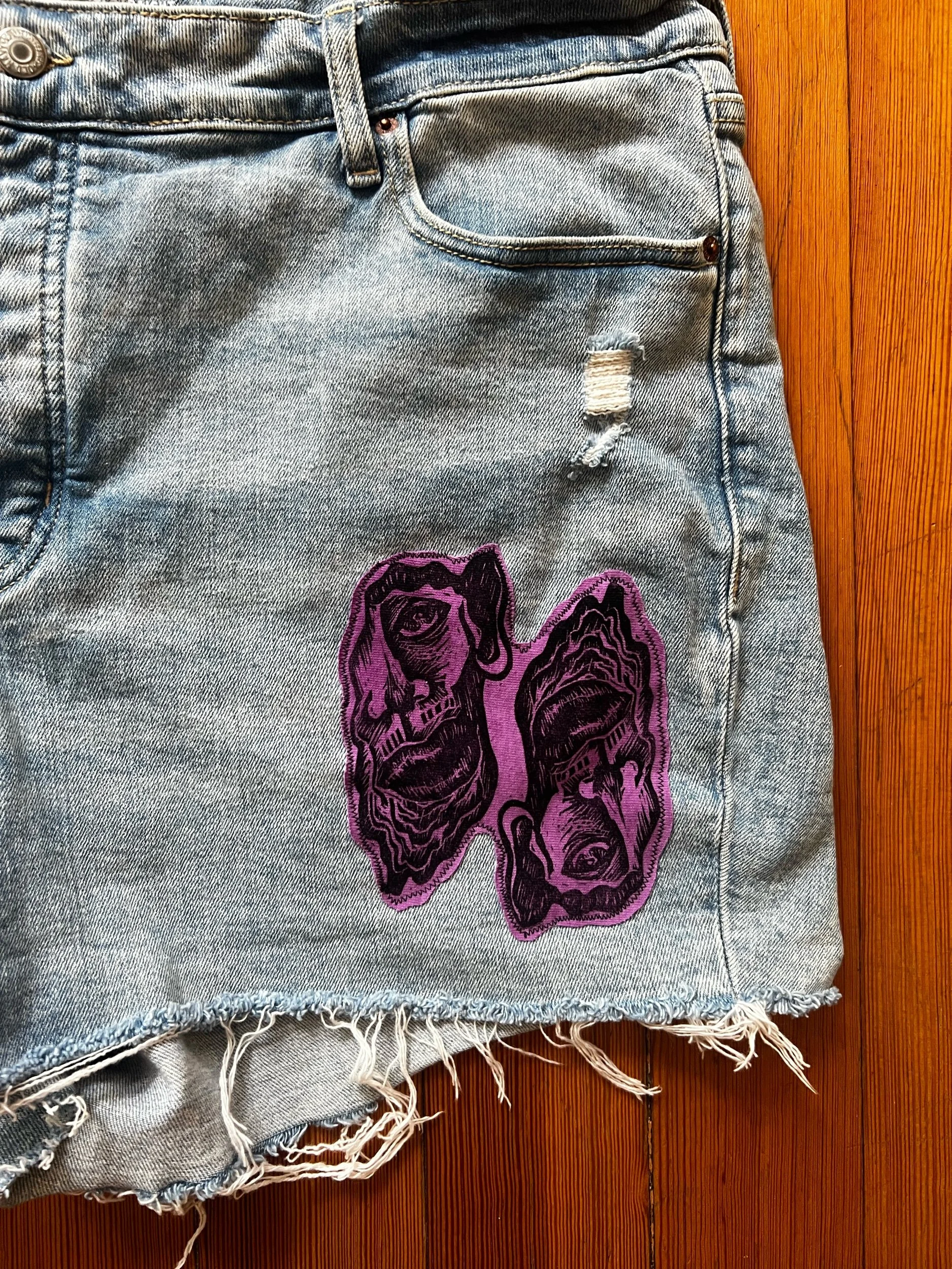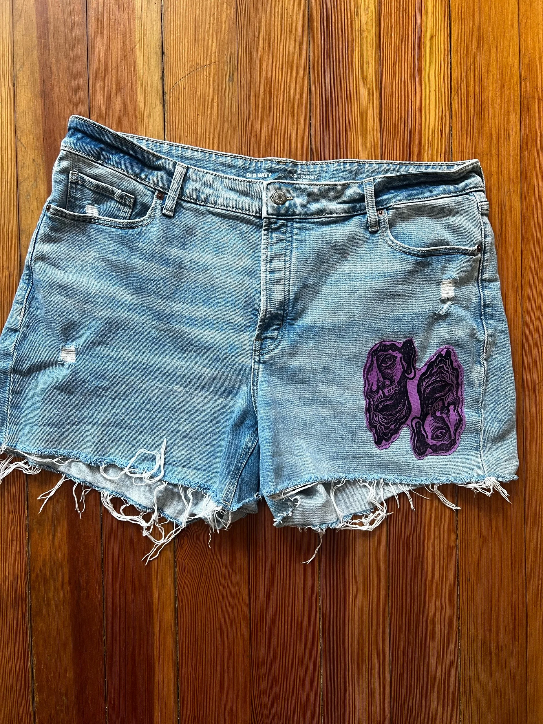 Shop › Faces Denim Shorts Image 1 of 3 Image 2 of 3 Image 3 of 3 Faces Denim Shorts $25.00 Upcycled Old Navy Denim ShortsSize 20 Sewn on Hand-Block Printed PatchesOriginal Artwork by Shira Mae Add To Cart Added! Upcycled Old Navy Denim ShortsSize 20 Sewn on Hand-Block Printed PatchesOriginal Artwork by Shira Mae